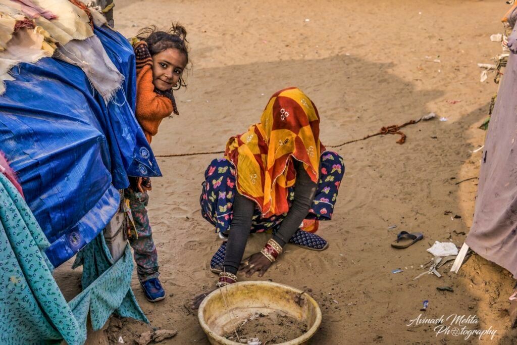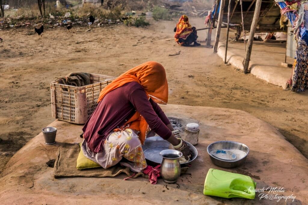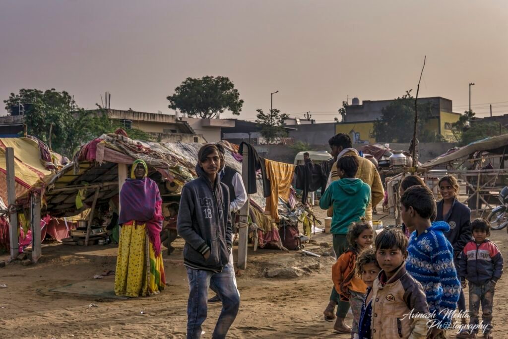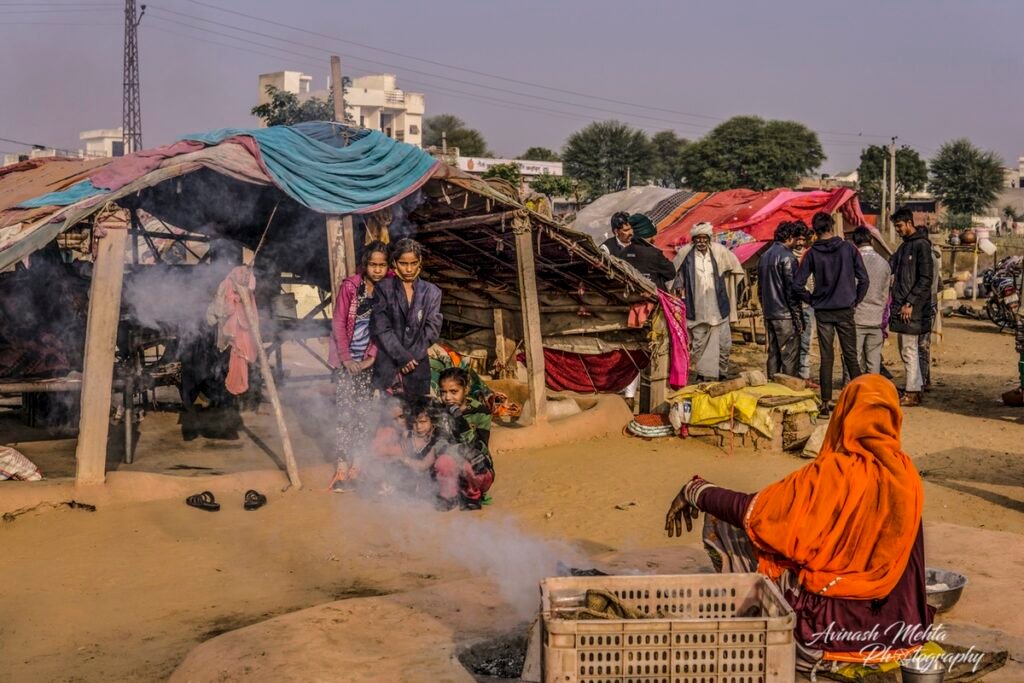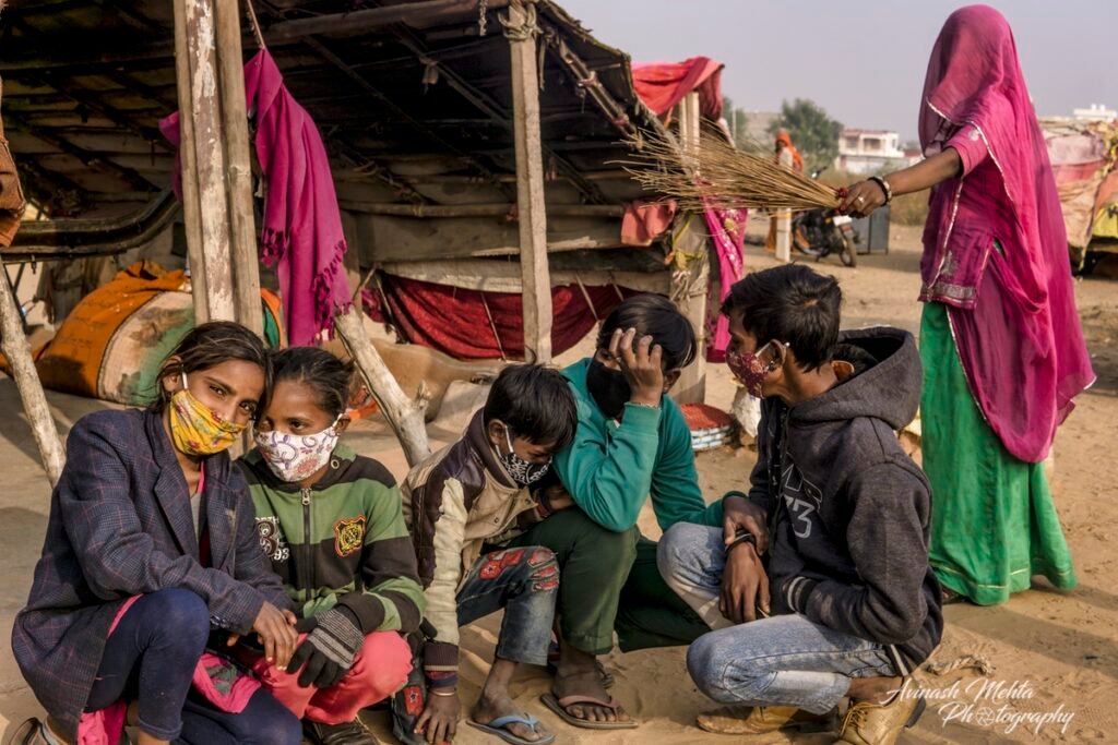 My Photowalk this winter’s morning was an encounter with the extended family of nomads or gipsies, an ancient and distinct community of Rajasthan. Every member of the family was busy fulfilling their assigned duties. Women were preparing meals and tidying up the domestic space. Menfolk and older children were filling up water needed by such a large group of people. The head of the family, the patriarch, was supervising the activities ensuring discipline and decorum within the family. The little ones of course were enjoying their childhood to the full. they were happily prancing around along with sundry domestic goats, dogs, and a couple of horses. Rajasthan nomads are well known for their music and the musicians of the family were practising their art filling the air with their happy melodies. A perfect tableau of the enduring family tradition of our culture. This robust lifestyle has provided them with good immunity and kept them safe from the raging Covid pandemic.