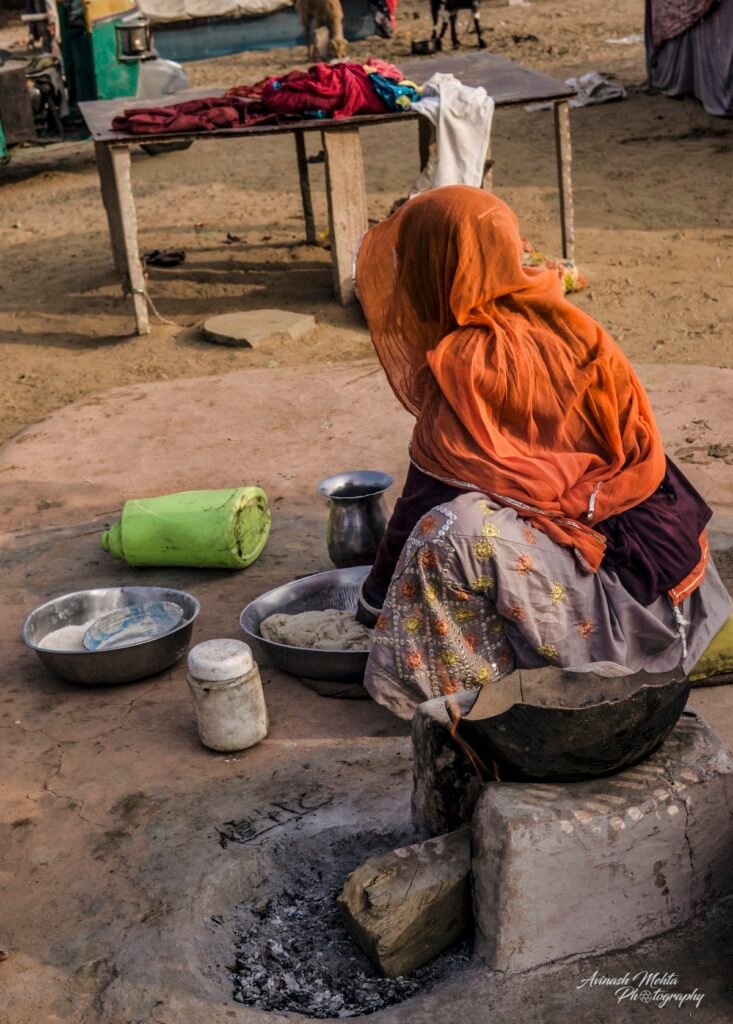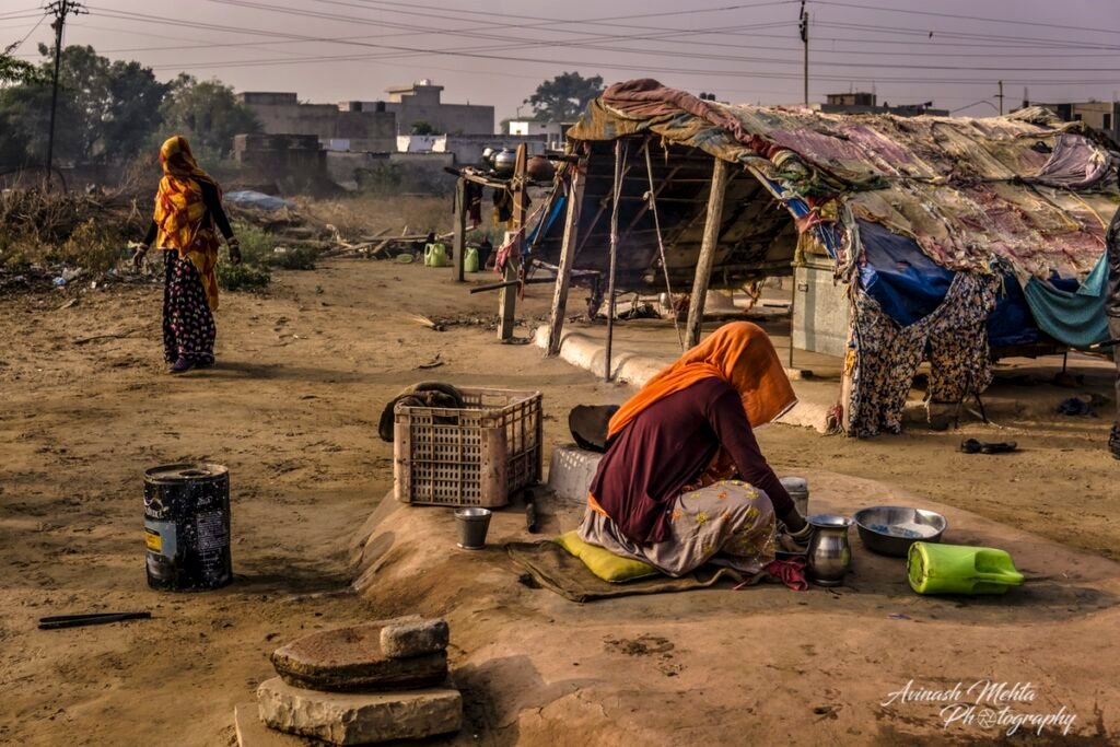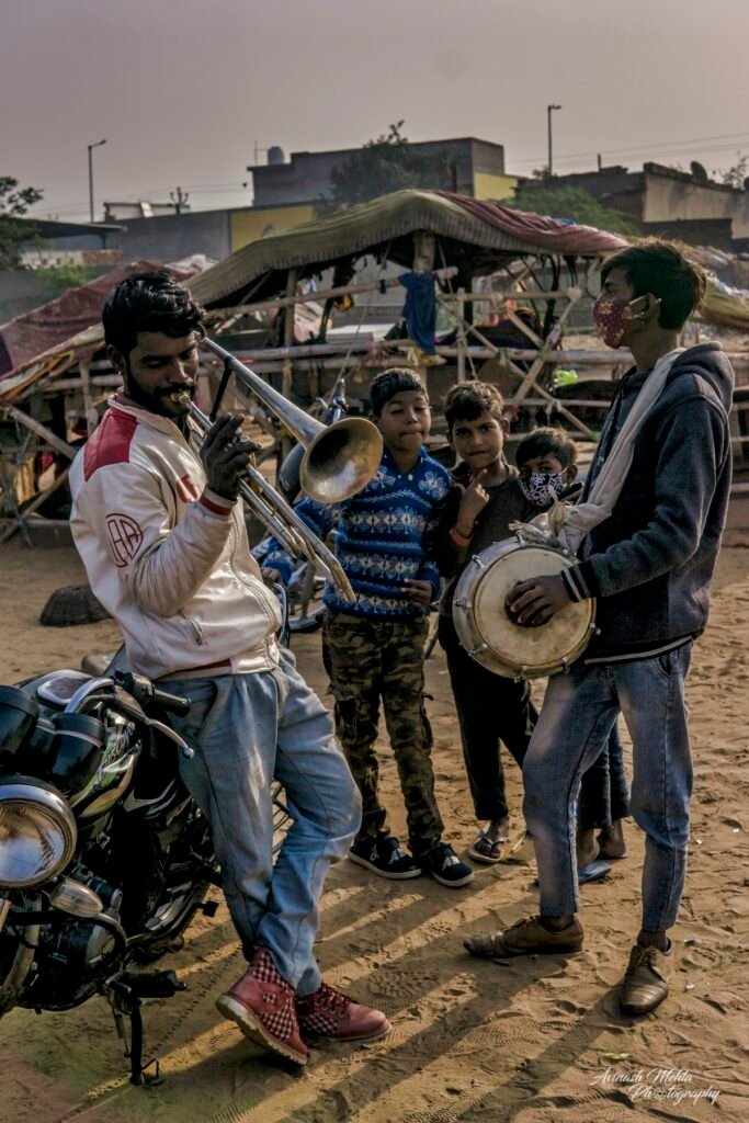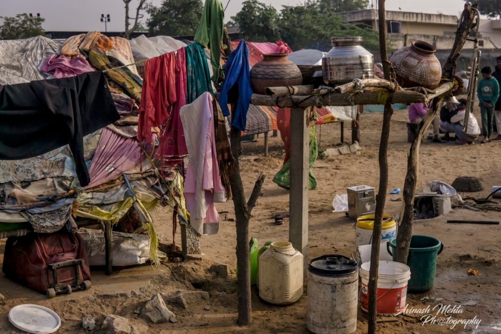 My Photowalk this winter’s morning was an encounter with the extended family of nomads or gipsies, an ancient and distinct community of Rajasthan. Every member of the family was busy fulfilling their assigned duties. Women were preparing meals and tidying up the domestic space. Menfolk and older children were filling up water needed by such a large group of people. The head of the family, the patriarch, was supervising the activities ensuring discipline and decorum within the family. The little ones of course were enjoying their childhood to the full. they were happily prancing around along with sundry domestic goats, dogs, and a couple of horses. Rajasthan nomads are well known for their music and the musicians of the family were practising their art filling the air with their happy melodies. A perfect tableau of the enduring family tradition of our culture. This robust lifestyle has provided them with good immunity and kept them safe from the raging Covid pandemic.