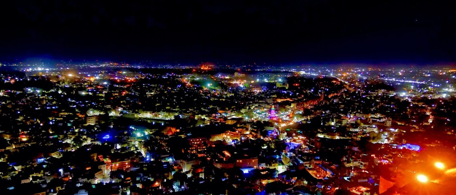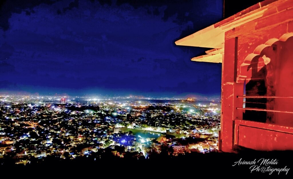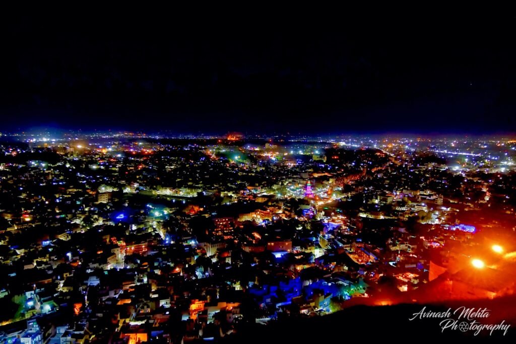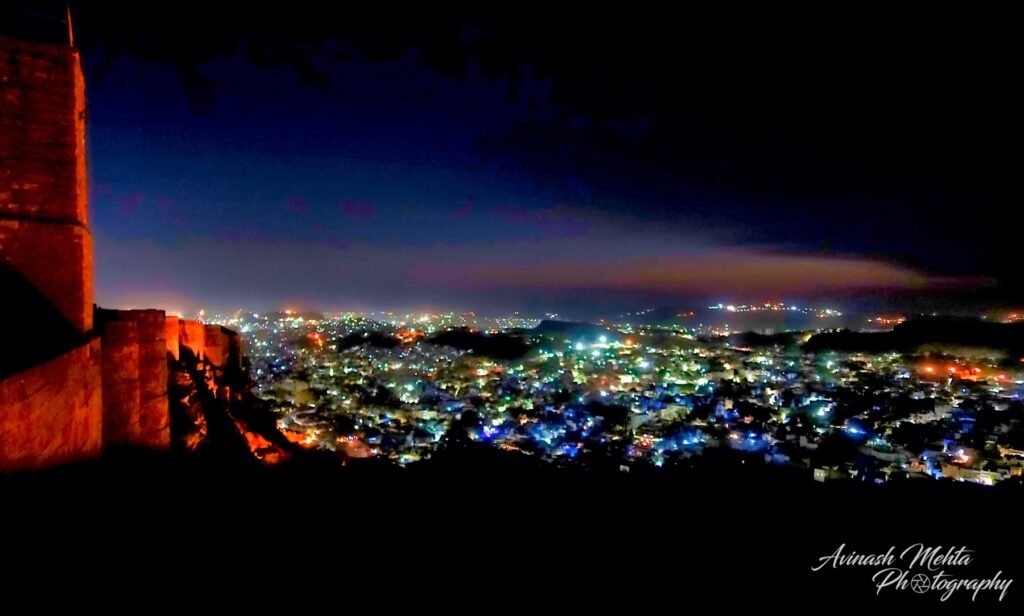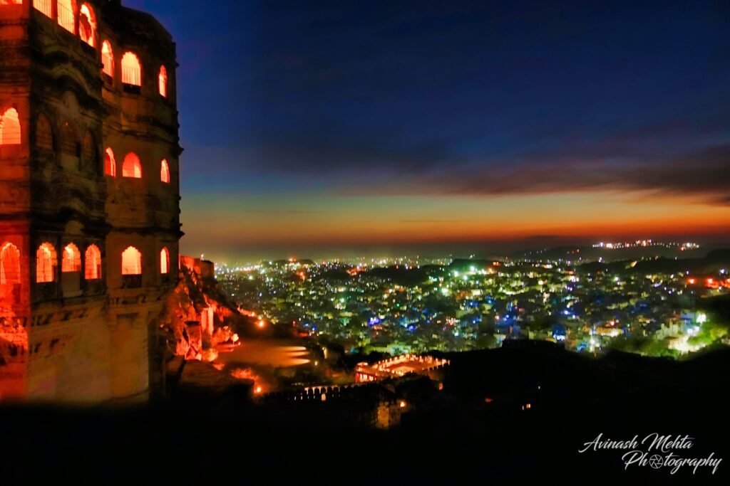 लिफ़्ट से उपर पहुँच कर जब मैंने देखा कि जोधपुर में सूर्यास्त के ठीक बाद हमारा जोधपुर नीले आकाश के तले लाइटों से जगमगाने लगता है इस पूरे परिदृश्य को देख कर मैं मंत्रमुग्ध हो गया और कुछ फ़ोटोज़ पूरे शहर के एरियल व्यू क्लिक किए व कुछ दुर्ग के परिवेश के साथ शहर व कुछ अंदर के फोटोज़ खैचने का सुअवसर मिला जो मैं आप सब के साथ साझा कर रहा हूँ।