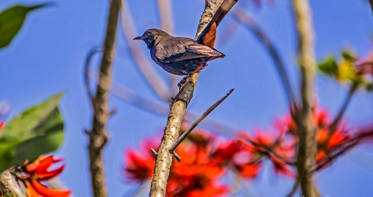Indian spring is a medley of soft cool breezes, colourful flowers, birdsongs, fluttering butterflies and nectar sipping bumblebees. Spring is nature’s song of life, of joy, and of hope. Here are a few pictures of birds flitting about in the richly colored Flame of the forest