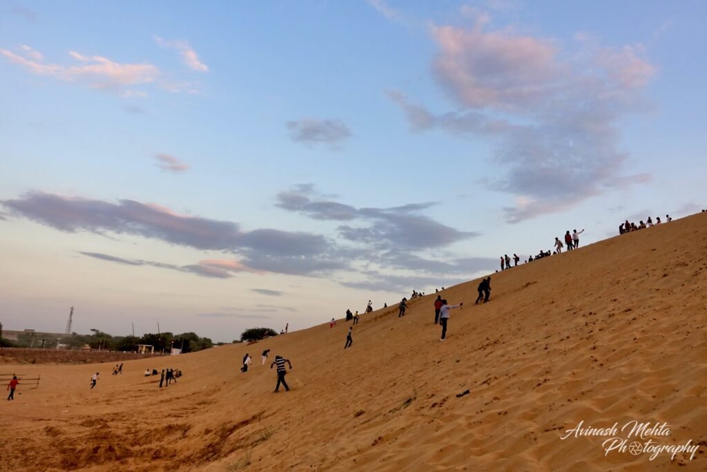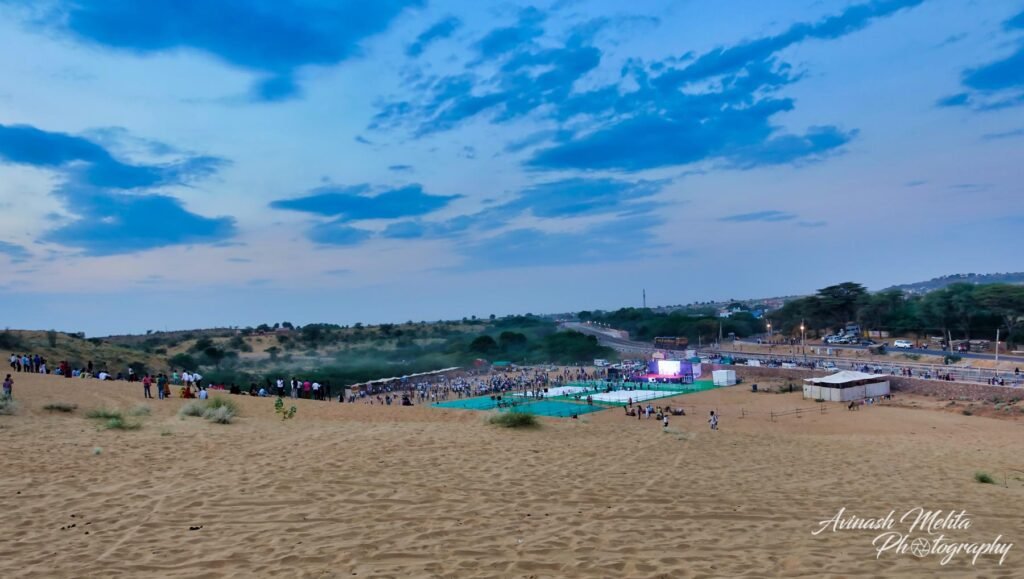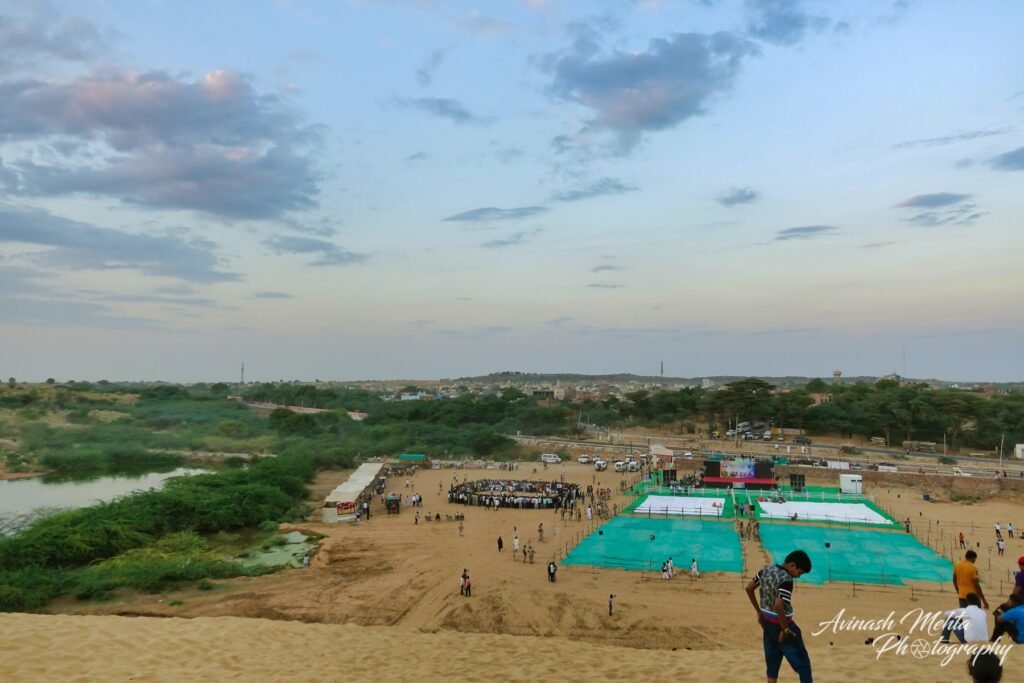 तीन तरफ़ ऊँचे ऊँचे रेत के धोरों व नीचे विशाल जन समूह के साथ समारोह के समापन का उत्साह व पारंपरिक खेलों की प्रतीस्पर्धाओं का आयोजन लोक गीतों के साथ आयोजन माहौल को ख़ुशनुमा बना रहा था वहीं दूसरी और ऊँचे धोरों पर पर्यटक सूर्यास्त के मनोरम दृश्य के साथ ऊँट संवारी का लुफ्त ले रहे थे।सारा दृश्य एवं परिदृश्यों का यह उत्सव मन मोहित कर रहा था।