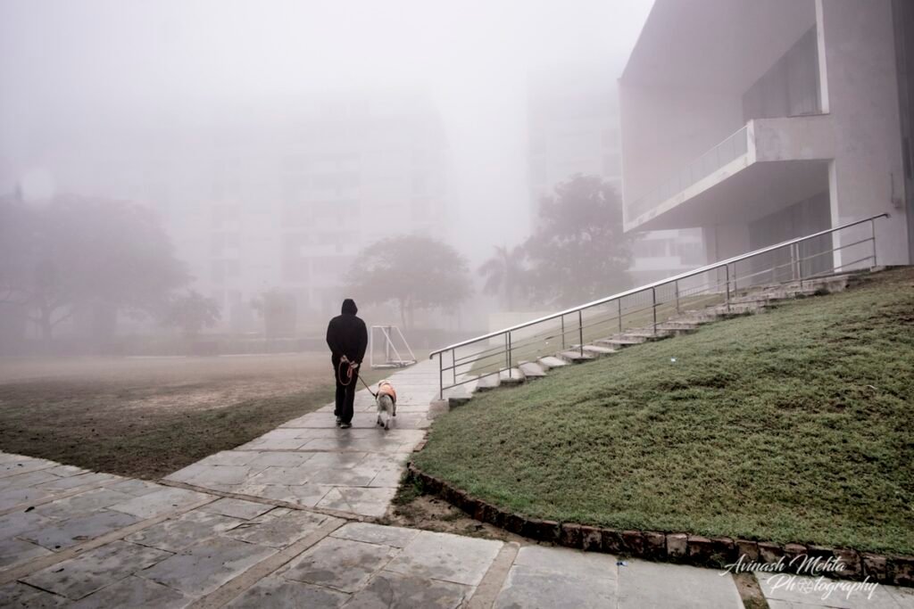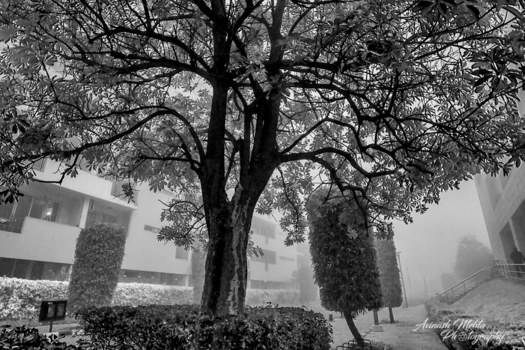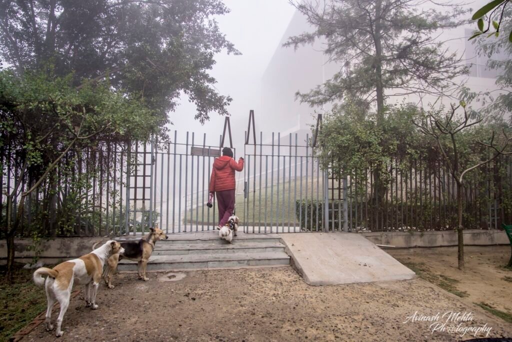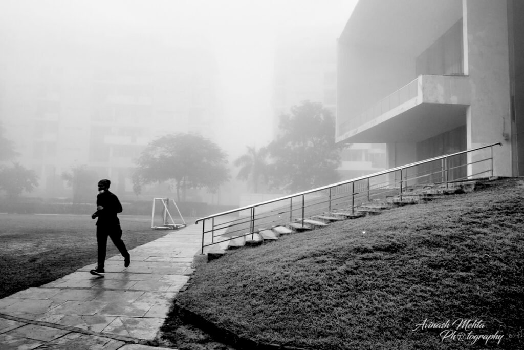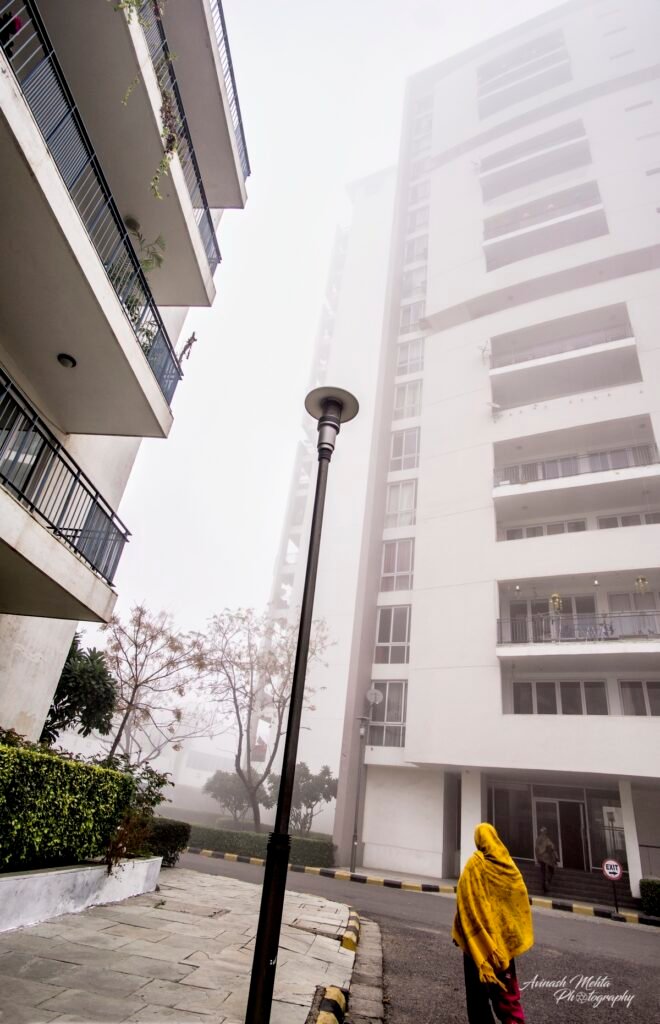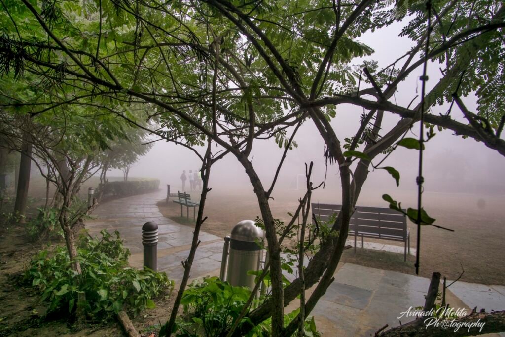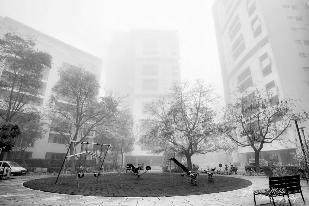 Freezing at 2 degrees Celsius, Delhi was cloaked in its trademark smog. And although the cold and low visibility has slowed down the brisk pace of the city, the business of living goes on. The daily staples, milkmen, newspaper boys, the domestic help do their rounds with the same commitment to work as before. Young and old, fond of the outdoors, go for their walks, play football, or take their pets for a stroll. Even Nature looks mesmerizing on a foggy day. My Photowalk today is of an immaculately maintained housing complex in Gurugram where I go cycling with my camera every morning.